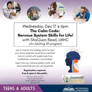 About the presenter: ShaQuan Read, LMHC is a Westborough parent, licensed psychotherapist, wellness educator, and yoga teacher who helps folks learn practical tools for stress, balance, and emotional well-being. She specializes in somatic (body-based) practices like mindfulness, movement, and nervous system regulation – making self-care accessible and empowering.