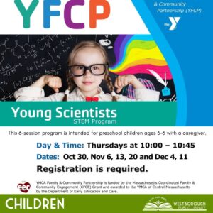 “Young Scientists” is sponsored by the YMCA Family & Community Partnership (YFCP), a Massachusetts Coordinated Family and Community Engagement (CFCE) Grant program funded by the Department of Early Education & Care and awarded to the YMCA of Central Massachusetts.